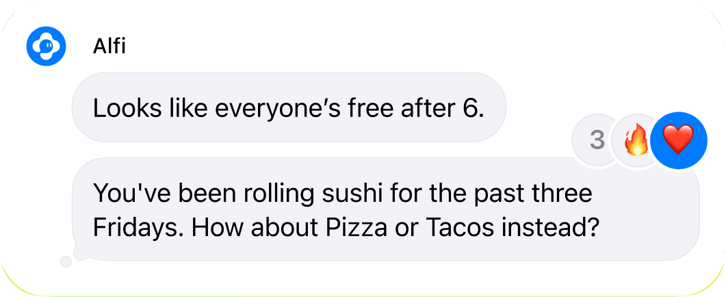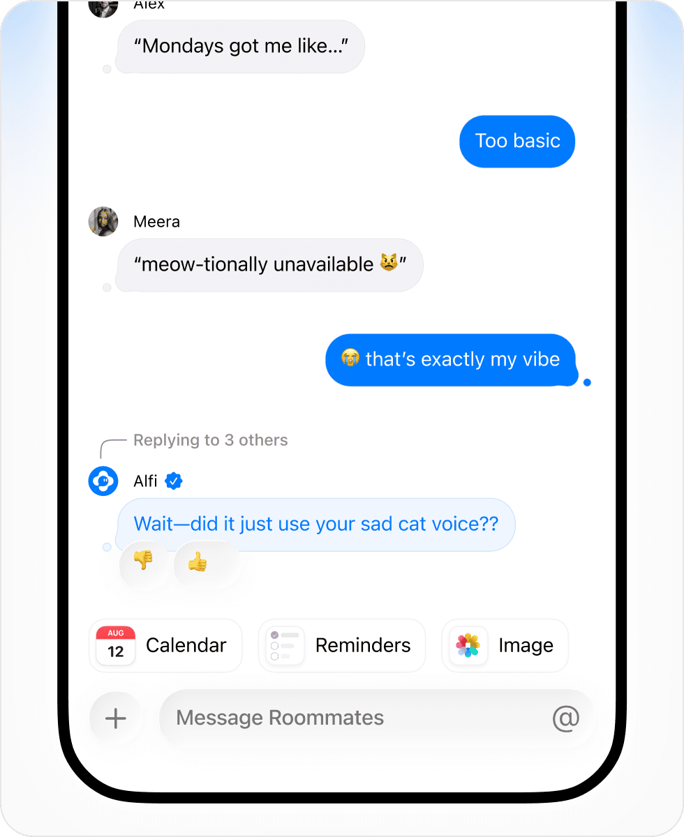 We’ve powered over 10 million messages — helping friends debate smarter, plan faster, and create together. Bringing Alfi into your chats makes conversations more useful, fun, and effortless.